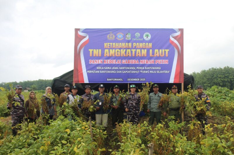sentralmerahputih.id | BANYUWANGI – TNI AL Lanal Banyuwangi. Sebagai wujud nyata dukungan TNI Angkatan Laut terhadap program ketahanan pangan pemerintah, Pangkalan TNI AL (Lanal) Banyuwangi melaksanakan panen raya kedelai varietas “Garuda Merah Putih”. Kegiatan ini berlangsung di Lahan Ketahanan Pangan Lanal Banyuwangi yang berlokasi di Alas Purwo, Dusun Kutorejo, Desa Kalipait, Kecamatan Tegaldlimo, Kabupaten Banyuwangi, Senin (08/12/2025).
