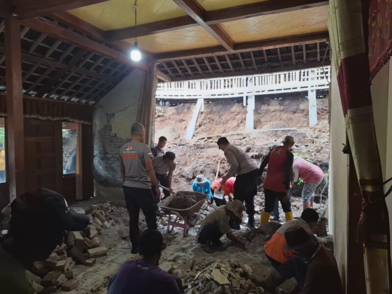 sentralmerahputih.id | Ngawi – Jajaran Polsek Kendal Polres Ngawi bersama TNI, Pemerintah Desa, Kecamatan dan relawan, serta masyarakat sekitar melaksanakan kegiatan pembersihan dan inventarisasi pasca kejadian longsor pondasi pekarangan rumah beberapa warga di Dusun Duwet, Desa Karanggupito, Kecamatan Kendal, Kabupaten Ngawi, pada Minggu (18/1/2026).