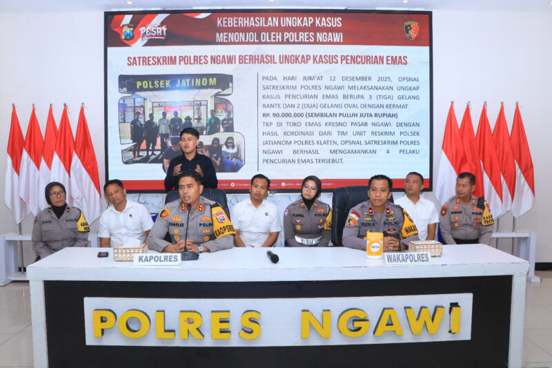 sentralmerahputih.id | NGAWI – Polres Ngawi dibawah kepemimpinan Kapolres Ngawi AKBP Charles Pandapotan Tampubolon, S.I.K., S.H., M.H., kembali menorehkan keberhasilannya, dengan mengungkap kasus pencurian perhiasan emas di Toko Emas Kresno, Jalan Mangkubumi No. 07, Kelurahan Ketanggi, Kecamatan/Kabupaten Ngawi.