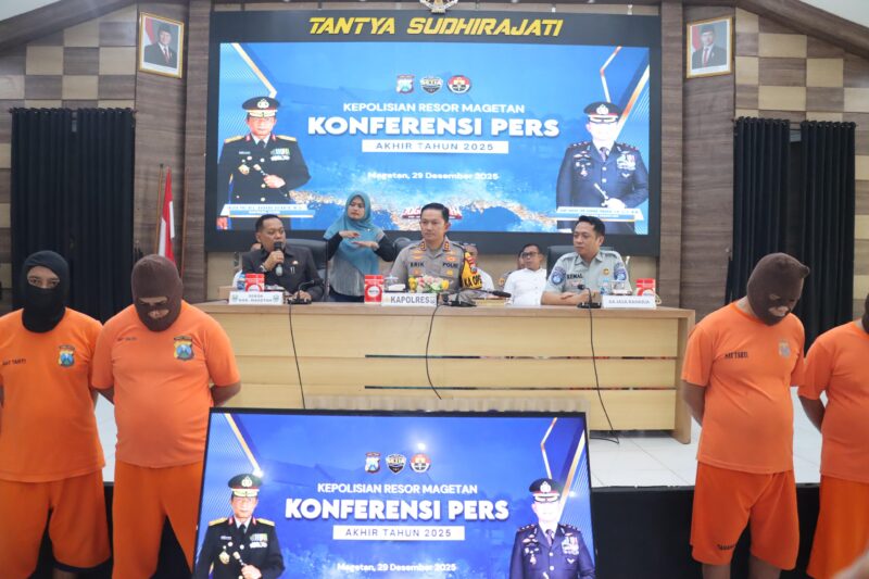sentralmerahputih.id | Magetan – Polres Magetan menggelar konferensi pers rilis akhir tahun 2025 yang berlangsung di Aula Pesat Gatra Polres Magetan, Senin (29/12/2025). Kegiatan ini dipimpin langsung oleh Kapolres Magetan AKBP Raden Erik Bangun Prakasa, S.H., S.I.K., M.M., didampingi Pejabat Utama (PJU) Polres Magetan.
