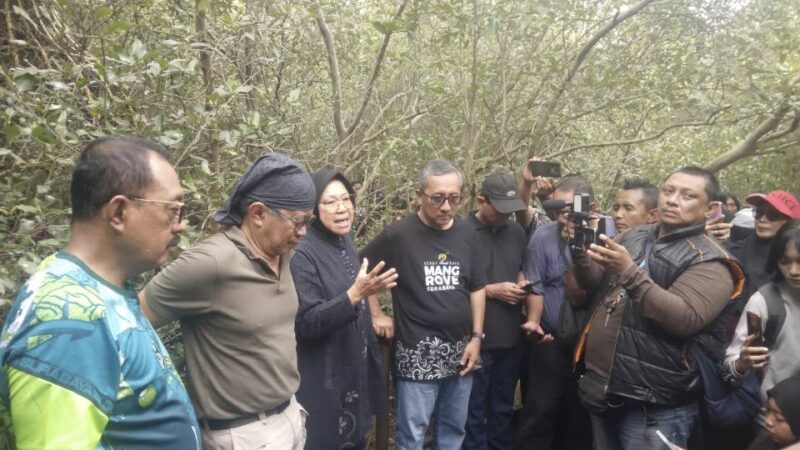 Di kawasan hutan mangrove, mantan Wali Kota Surabaya dua periode yang akrab disapa Risma mengajak rombongan menyusuri area konservasi sambil menjelaskan fungsi strategis mangrove bagi keberlanjutan kota pesisir.