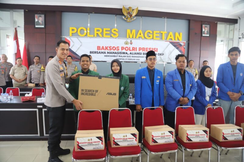 Selain penyaluran paket sembako, Kapolres Magetan juga menyerahkan tiga perangkat komputer kepada BEM STAIM Magetan, BEM Universitas Dr. Nugroho Magetan, dan PMII Magetan. Bantuan ini bertujuan untuk menunjang aktivitas organisasi kemahasiswaan, khususnya dalam mendukung kegiatan akademik dan sosial yang lebih produktif.